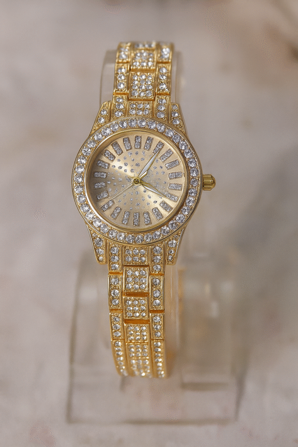 Add a touch of glamour to your wrist with this Luxury Gold-Plated Diamond-Style Women’s Watch. Designed with a dazzling stone-studded dial and strap, this watch is the perfect blend of style, elegance, and sophistication. Whether it’s a wedding, party, or a special evening out, this timepiece makes sure you stand out.
